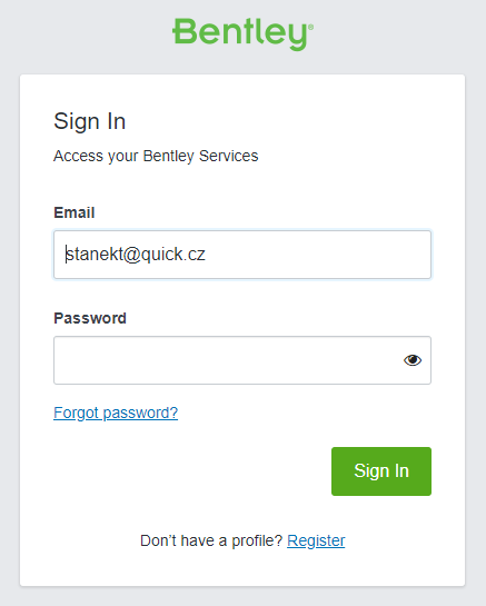 Pokud již uživatel má e-mailovou adresu registrovánu u Bentley, zadá tento e-mail a heslo (obrázek pod odstavcem vlevo). Následně bude přepojen do Webového prostředí ProjectWise.