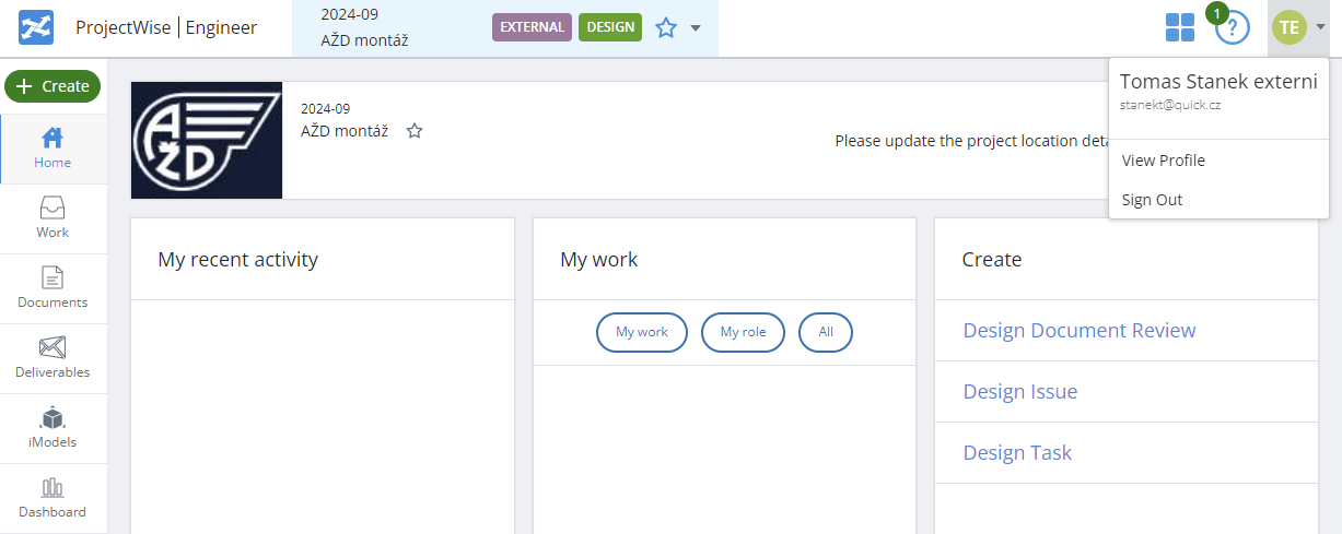 Do hlavní obrazovky se lze vždy vrátit kliknutím na ikonu „Home“ v levém svislém menu. Do přehledu projektů se dostanete kliknutím na ikonu ProjectWise v levém horním rohu obrazovky.