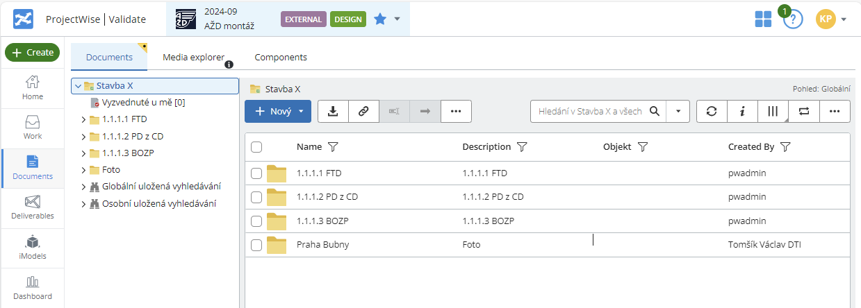 Pro přístup k dokumentům projektu, umístěným v řízeném datovém úložišti ProjectWise, slouží ikona „Documents“, umístěná ve svislém menu na levé straně obrazovky.
