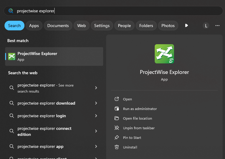 Stiskněte klávesu Windows (Start) a zadejte příkaz ProjectWise Explorer.