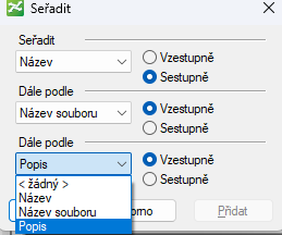 - Pokud chcete přidat sekundární sloupec, podle kterého se má řadit, klikněte na tlačítko Přidat, poté vyberte vlastnost sloupce ze seznamu Potom podle a nastavte, zda se má tento sloupec řadit vzestupně nebo sestupně.