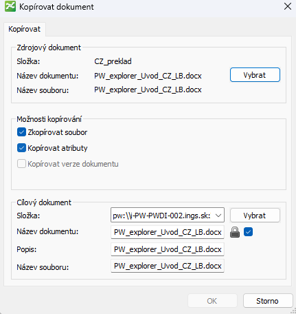 Pokud jako cílovou složku použijete zdrojovou složku, musíte změnit název dokumentu i název souboru. Pokud dokument zkopírujete do jiné složky, můžete ponechat stávající název dokumentu a název souboru, pokud se v cílové složce již nenachází dokument se stejným názvem dokumentu nebo souboru. Popis dokumentu je volitelný.
