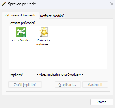 - Pokud chcete, aby se v dialogovém okně Vytvořit dokument otevřelo okno Dokument > Nový, vyberte ikonu Bez průvodce a klikněte na tlačítko Nastavit jako výchozí.