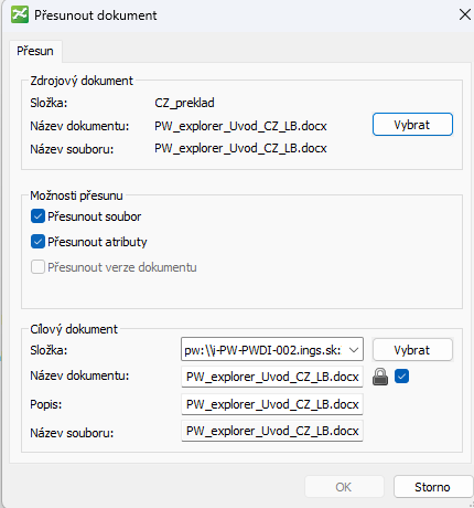Otevře se dialogové okno Přesunout dokument. Dokument, který jste vybrali k přesunu, se zobrazí v části Zdrojový dokument. Vlastnosti Složka, Název dokumentu, Popis a Název souboru v části Cílový dokument jsou předvyplněny vlastnostmi vybraného dokumentu.