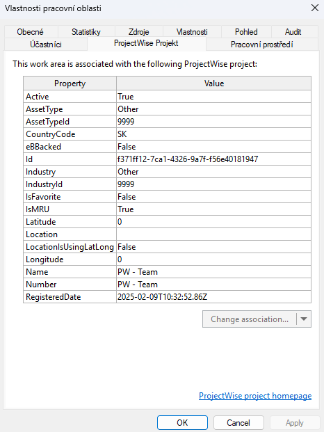 Tato pracovní oblast je nyní spojena s vybraným projektem ProjectWise.