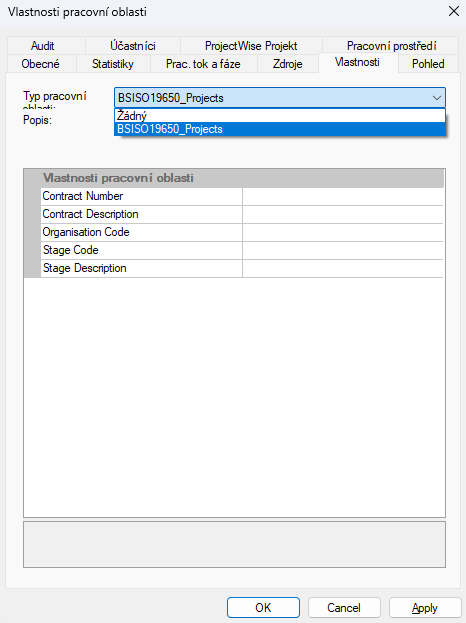 - V dialogovém okně Vlastnosti pracovní oblasti vyberte kartu Vlastnosti.
