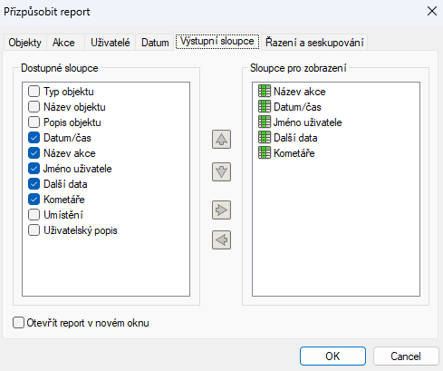 Poznámka: Při přizpůsobení sestavy auditní stopy pro dokumenty stačí nastavit možnosti pouze jednou v dialogovém okně Přizpůsobit sestavu a budou použity pro všechny vytvořené sestavy auditní stopy dokumentů, dokud nastavení v dialogovém okně Přizpůsobit sestavu znovu nezměníte. Nastavení v dialogovém okně Přizpůsobit sestavu pro auditní stopu dokumentu nemá vliv na nastavení v dialogovém okně Přizpůsobit sestavu pro auditní stopu složky. Postupy pro použití dialogového okna jsou však v podstatě stejné.