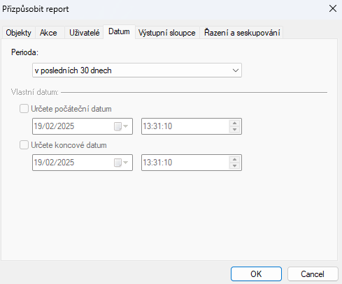Poznámka: Pokud nemáte v nastavení uživatele přidělena oprávnění k zobrazení auditní stopy jiných uživatelů, jsou možnosti na této kartě zakázány.