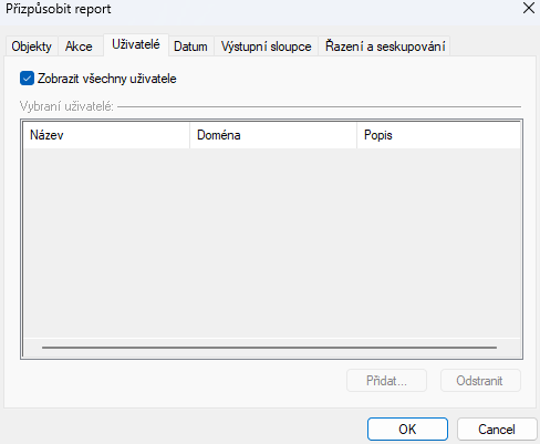 - Chcete-li do sestavy zahrnout akce způsobené určitými uživateli, vypněte možnost Zobrazit všechny uživatele, poté v seznamu vyberte uživatele, které chcete odstranit, a klikněte na tlačítko Odstranit. Chcete-li do sestavy přidat uživatele, klikněte na tlačítko Přidat.