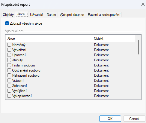 - Chcete-li do zprávy zahrnout všechny typy akcí, zapněte možnost Zobrazit všechny akce.
