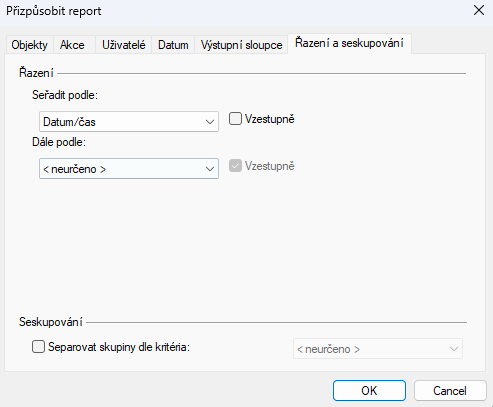 - V seznamu Seřadit podle vyberte kritéria pro první nebo nejvyšší úroveň řazení a poté nastavte možnost Vzestupně, pokud chcete akce seřadit vzestupně. Pokud například vyberete možnost Typ objektu, všechny záznamy se stejným názvem dokumentu se seřadí společně vzestupně (od nejnižšího po nejvyšší).