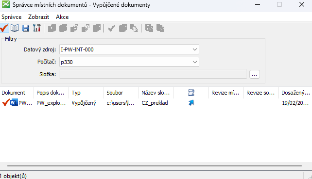 Místní organizátor dokumentů (Nástroje > Správce místních dokumentů) slouží k zobrazení seznamu a správě dokumentů, které jste aktuálně odhlásili, zkopírovali nebo exportovali, a také všech souvisejících dokumentů pracovního prostoru, které byly zkopírovány v důsledku odhlášení, zkopírování nebo exportu. Zobrazený seznam dokumentů můžete filtrovat podle datového zdroje (pokud jste přihlášeni k více datovým zdrojům) nebo podle konkrétní složky či pracovní oblasti v konkrétním datovém zdroji.
