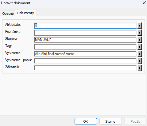 Úprava hodnot atributů pomocí dialogového okna Upravit dokument