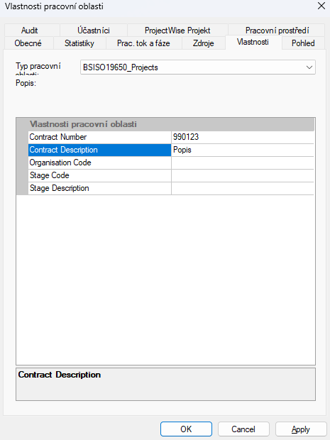 Seznam zobrazuje název a hodnotu každé vlastní vlastnosti dostupné v typu pracovní oblasti, která je aktuálně přiřazena této pracovní oblasti . V levém sloupci jsou zobrazeny názvy vlastností a v pravém sloupci hodnoty vlastností.