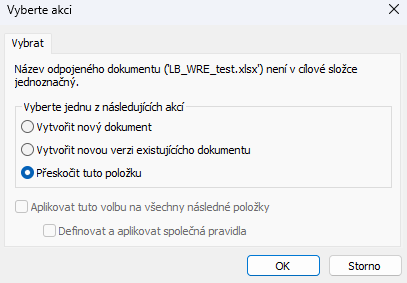 - Volitelné: Pokud přetahujete více dokumentů a více než jeden z nich je v konfliktu a chcete vytvořit nový dokument pro všechny dokumenty v konfliktu, zapněte možnost Použít tuto volbu pro všechny následující položky.