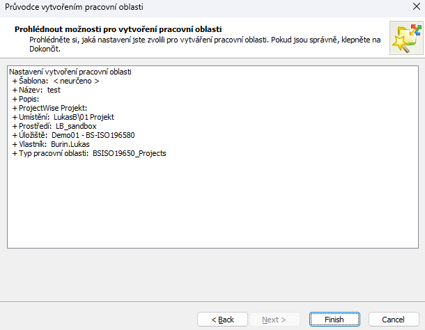 - Projekt ProjectWise - Pokud chcete tuto pracovní oblast přiřadit k projektu ProjectWise , klikněte na tlačítko Vybrat a vyberte požadovaný projekt ProjectWise.