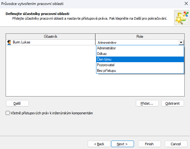 - Pokud bude některý z účastníků potřebovat oprávnění k zabezpečení komponenty, zapněte možnost Včetne přístupových práv k inženýrským komponentám.