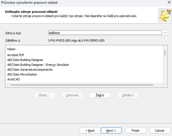 Otevře se stránka Definovat zdroje pracovní oblasti, kde můžete vybrat zdroje, které mají být v pracovní oblasti k dispozici . Ve výchozím nastavení vytvářená pracovní oblast automaticky zdědí zdroje pracovní oblasti nebo složky nad ní. Následné pracovní oblasti nebo složky vytvořené pod touto pracovní oblastí zdědí zdroje, které zde nastavíte. Pokud vytváříte pracovní oblast pod kořenovou složkou Dokumenty, budou do ní zahrnuty všechny zdroje aktuálně definované ve správci ProjectWise.