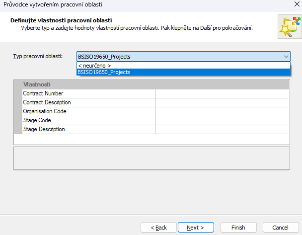 - Pokud chcete typ pracovní oblasti nastavit později (po vytvoření pracovní oblasti), ponechte typ pracovní oblasti nastavený na <žádný> a klikněte na tlačítko Další.