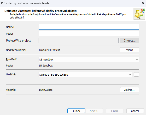 - Vlastník - Ve výchozím nastavení je vlastníkem pracovní oblasti uživatel, jako který jste přihlášeni. Chcete-li jako vlastníka nastavit jiného uživatele, klikněte na tlačítko Změnit.