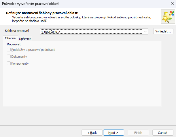- Pokud nechcete použít šablonu, nastavte možnost Pracovní oblast šablony na hodnotu <žádná> a klikněte na tlačítko Další.