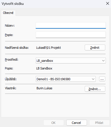 - Prostředí - prostředí nové složky se automaticky nastaví na prostředí nadřazené složky. Chcete-li toto nastavení změnit, vyberte ze seznamu jiné prostředí. Prostředí můžete také nastavit na hodnotu <žádné>, pokud nechcete, aby tato složka používala žádné prostředí.