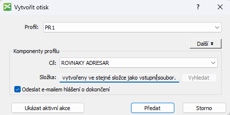 - V dialogovém okně Vytvořit otisk vyberte profil vykreslení ze seznamu Profil, podle potřeby změňte další nastavení a klikněte na tlačítko Předat.