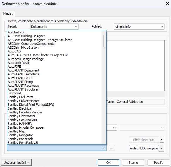 Například při výběru vlastnosti Aplikace se v seznamu Hodnoty zobrazí všechny aplikace ProjectWise definované v datovém zdroji a výběr jedné z těchto hodnot omezí vyhledávání na dokumenty spojené s touto konkrétní aplikací. Pro vlastnost, jako je Název souboru, však můžete buď zadat nějakou hodnotu nebo vlastní výraz do pole Hodnota, nebo můžete klepnutím na tlačítko Formát vytvořit vlastní vyhledávací výraz.