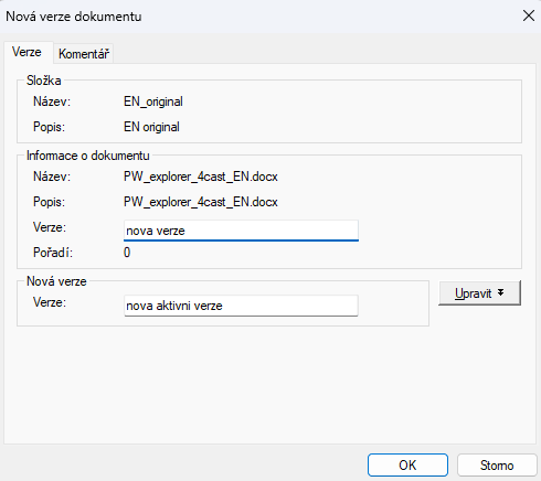 - Pole Verze v části Dokument je předvyplněno štítkem aktuální aktivní verze a slouží k nastavení štítku pro novou verzi. Proveďte jednu z následujících akcí: