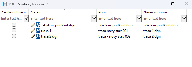 Okno s nastavením zůstává viditelné i při výběru v aplikaci ProjectWise Explorer . Po přidání prvního dokumentu se sada automaticky vytvoří v ProjectWise , a zobrazí se v seznamu dokumentů původně vybrané složky. V okně sady se zobrazí název a stavová ikona každého dokumentu.