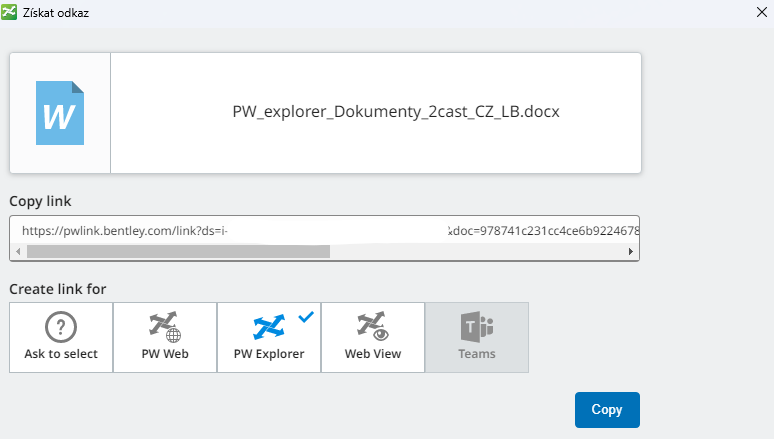 - V dialogovém okně Získat odkaz vyberte položku Průzkumník PW a klikněte na tlačítko Kopírovat.