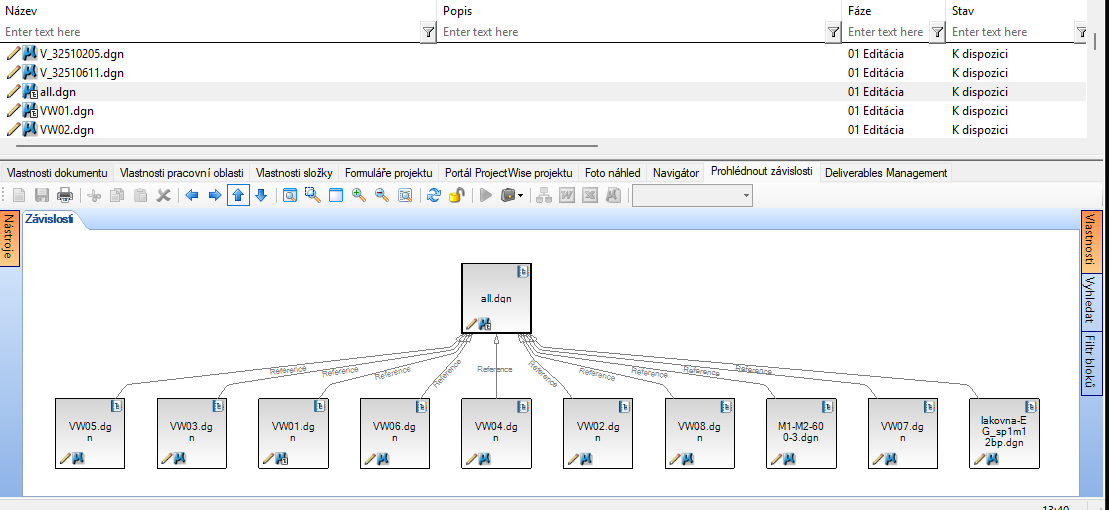 Karta Prohlížeč závislostí v podokně náhledu umožňuje uživatelům zobrazit závislosti, které existují mezi dokumenty (označované jako závislosti dokumentů) ve zdroji dat. (Prohlížeč závislostí je volitelnou součástí instalačního programu aplikace ProjectWise Explorer.)