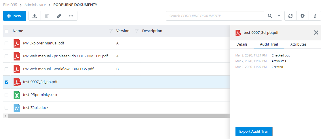 V tomto panelu lze kliknutím na příslušnou záložku „Audit Trail“, zobrazit též informace o historii práce s dokumentem. Tyto informace lze vyexportovat do formátu .xlxs.