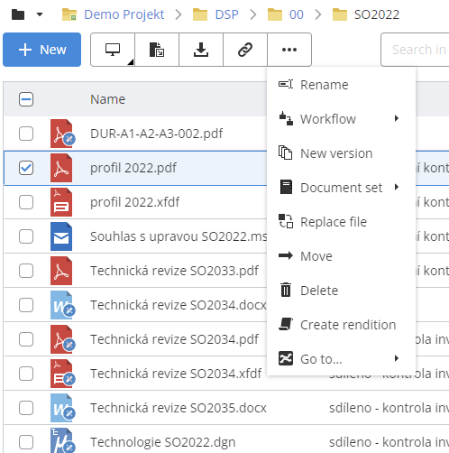 Každá akce s dokumentem je limitovaná přístupovými právy. Proto se může lišit i zobrazení menu na práci s dokumenty. Dostupné funkce pro práci s dokumenty jsou k dispozici na „pravé tlačítko“ (viz obrázek níže), případně po označení souboru pod ikonou v menu nad oknem souborů.