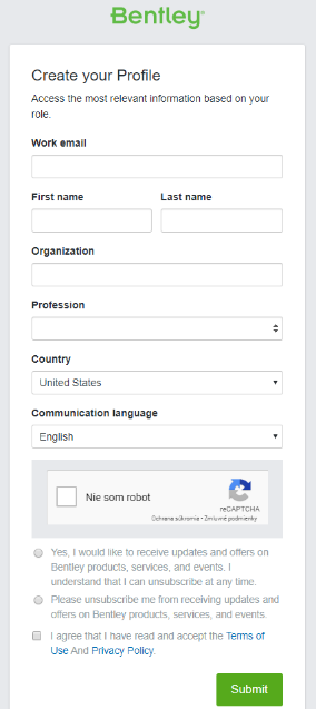 Pokud již uživatel má e-mailovou adresu registrovánu u Bentley, zadá tento e-mail a heslo (obrázek pod odstavcem vlevo). Následně bude přepojen do Webového prostředí ProjectWise.