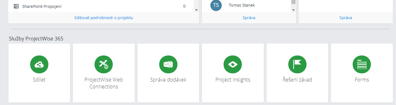 Pro přístup k dokumentům projektu, umístěným v řízeném datovém úložišti ProjectWise, slouží ikona „ProjectWise Web Connections“, umístěná v sekci služeb ProjectWise 365.