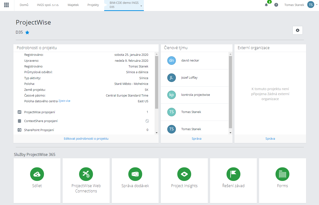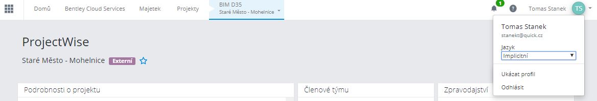 Pokud se hlásí přes všeobecnou adresu portálu connect.bentley.com či z jiného místa (např. webové stránky Bentley), musí nejprve zvolit, v horní liště stránky, záložku „Projekt“ a vybere z přehledu příslušné jméno projektu, kde je jako uživatel evidován.