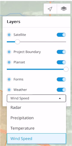- Weather: Zobrazuje různé vrstvy počasí jako Radar, Precipitation, Temperature nebo Wind speed. Barevná legenda a ovládání časové osy poskytují další informace, přičemž rychlost časové animace je možné upravit přes ikonu se třemi tečkami.
