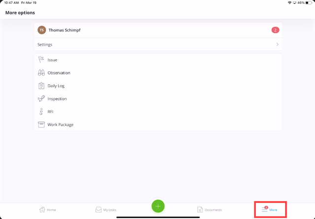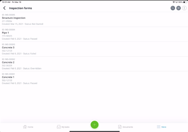 Chcete-li otevřít stránku Inspection Summary Table z domovské stránky projektu, klikněte na tlačítko More v dolní části obrazovky a poté vyberte Inspection na stránce More Options.
