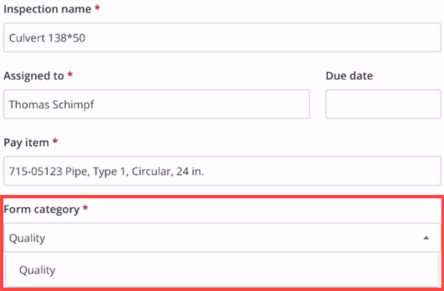 Form Category je předvyplněné rozbalovací menu, které umožňuje uživateli kategorizovat formulář inspekce. Form je předvyplněné rozbalovací menu, kde uživatel vybírá typ formuláře inspekce.