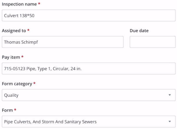 Při vytváření nové inspekce jsou všechna pole označená červenou hvězdičkou (*) povinná a musí být vyplněna, aby bylo možné inspekci uložit.